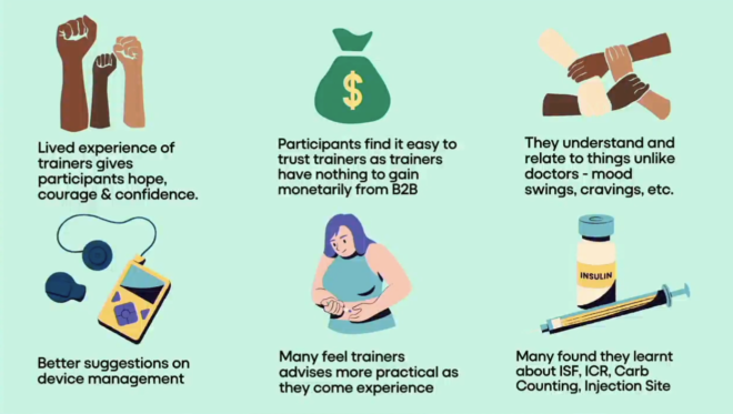 Uno dei programmi gestiti da Diabesties è un programma educativo telefonico chiamato Back to Basics (B2B). I dati di un sondaggio hanno dimostrato i seguenti punti di forza e vantaggi dell’impiego di peer educator nel programma B2B: